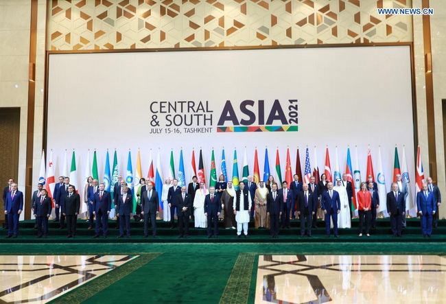 Chinese State Councilor and Foreign Minister Wang Yi (6th R, front row) attends a high-level international conference themed "Central and South Asia: Regional Connectivity, Challenges and Opportunities" in Tashkent, Uzbekistan, July 16, 2021. (Xinhua/Cai Guodong)