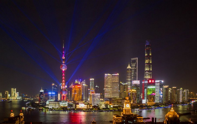 A light show at Lujiazui area in Pudong District of east China's Shanghai, Sept. 26, 2019. (Xinhua/Ren Long)