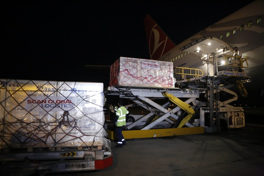 Staff members unload Chinese Sinopharm COVID-19 vaccines at Islamabad International Airport, Pakistan, Aug. 11, 2021. (Xinhua/Ahmad Kamal)