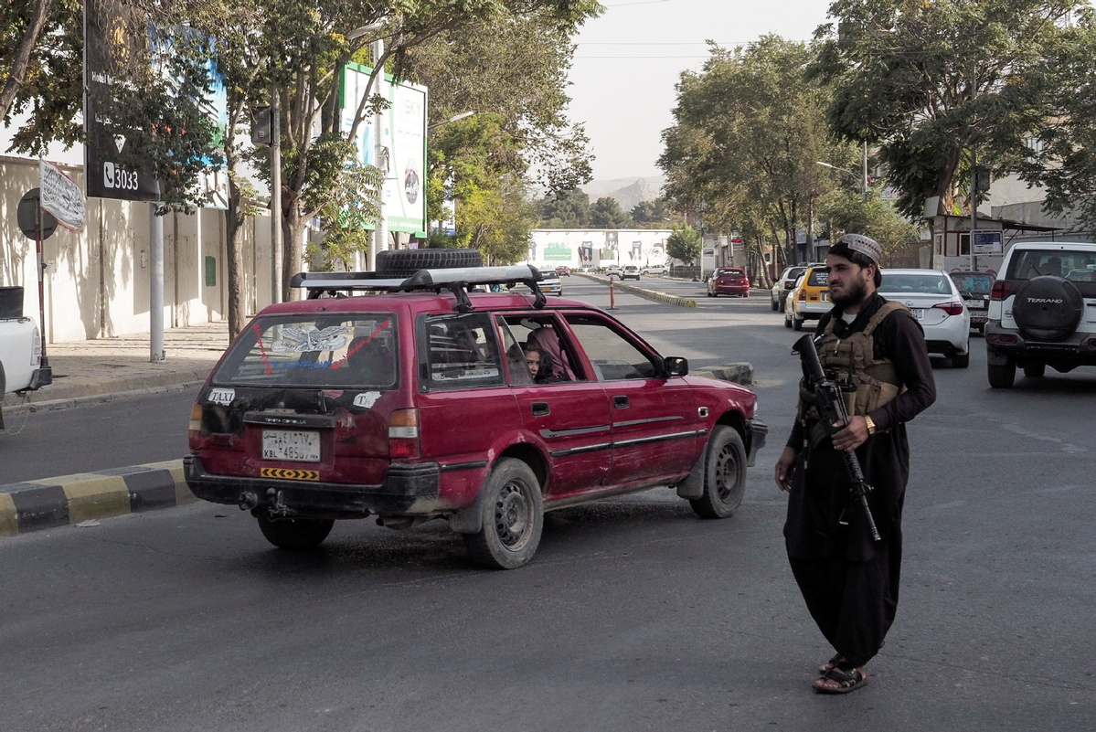 A Taliban fighter guards a check-point on a main street in Kabul, on Aug 29, 2021. [Photo/Agencies]