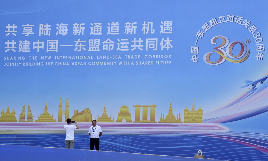 A man poses for a photo in front of a poster marking the 30th anniversary of the establishment of China-ASEAN dialogue relations in Nanning, south China's Guangxi Zhuang Autonomous Region, Sept. 10, 2021. (Xinhua/Ma Ning)