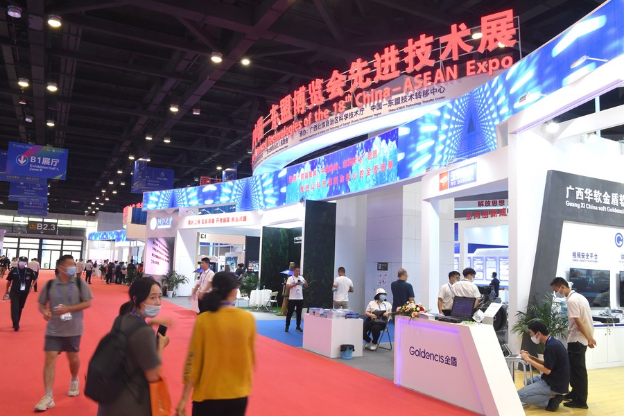 Visitors tour the advanced technologies exhibition area of the 18th China-ASEAN Expo held in Nanning, south China's Guangxi Zhuang Autonomous Region, Sept. 10, 2021. (Xinhua/Zhou Hua)