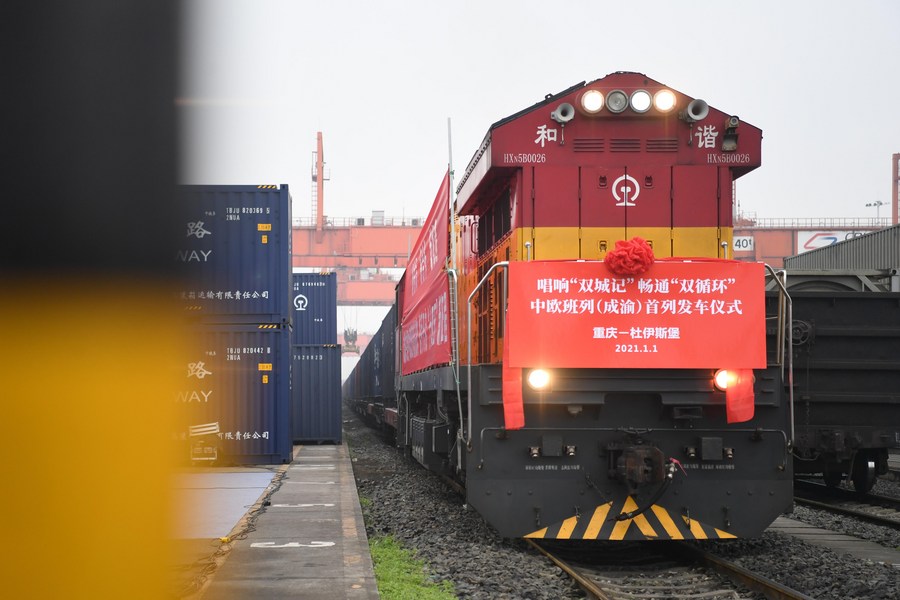 A China-Europe freight train bound for Duisburg of Germany prepares for departure at Tuanjiecun Station in southwest China's Chongqing, Jan. 1, 2021. (Xinhua/Tang Yi)