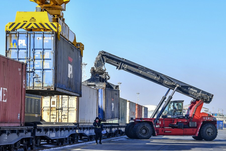 Workers load a container onto a train at Urumqi China-Europe Railway Express Hub in Urumqi, capital of northwest China's Xinjiang Uygur Autonomous Region, March 12, 2020. (Xinhua/Wang Fei)