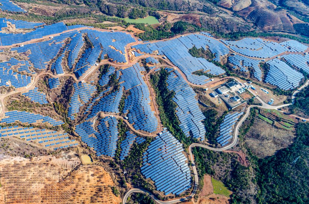Aerial photo taken on Feb. 16, 2022, shows a photovoltaic power station in Yongren County of Chuxiong Yi Autonomous Prefecture, southwest China's Yunnan Province. (Xinhua/Chen Xinbo)