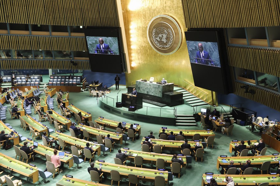 Abdulla Shahid, president of the 76th session of the United Nations (UN) General Assembly, speaks at the closing of the general debate of the 76th session of the UN General Assembly at the UN headquarters in New York, on Sept. 27, 2021. (Xinhua/Wang Ying)