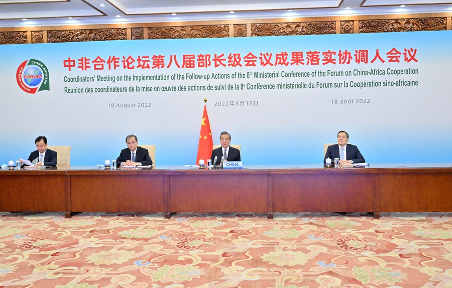 Chinese State Councilor and Foreign Minister Wang Yi chairs the coordinators' meeting on the implementation of the follow-up actions of the 8th Ministerial Conference of the Forum on China-Africa Cooperation (FOCAC) held in virtual format in Beijing, capital of China, Aug. 18, 2022. (Xinhua/Yue Yuewei)