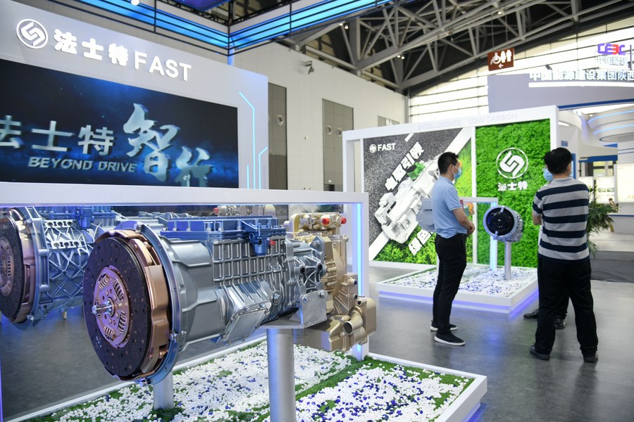 Visitors learn about products at the booth of Shaanxi Fast Auto Drive Group  Co., Ltd. during the Sixth Silk Road International Exposition in Xi'an, northwest China's Shaanxi Province, Aug. 16, 2022. (Xinhua/Li Yibo)