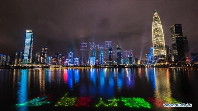 Photo taken on Aug 26, 2020 shows a light show in Shenzhen, South China's Guangdong province. A light show performed with 826 drones combined with city lights started at 8:26 pm local time on Aug 26 in Shenzhen to celebrate the 40th anniversary of the establishment of the Shenzhen Special Economic Zone (SEZ). [Photo / XINHUA]