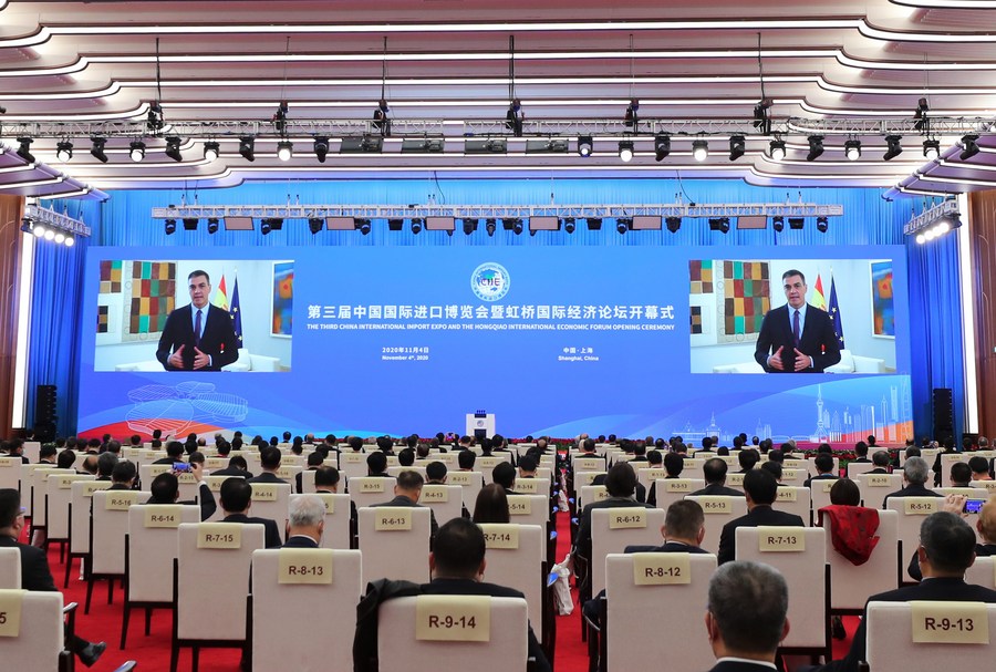 Spanish Prime Minister Pedro Sanchez gives a speech via video link at the opening ceremony of the third China International Import Expo (CIIE) held in east China's Shanghai, Nov. 4, 2020. (Xinhua/Fang Zhe)