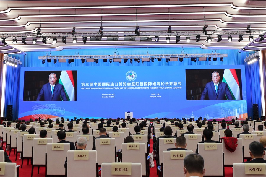 Hungarian Prime Minister Viktor Orban gives a speech via video link at the opening ceremony of the third China International Import Expo (CIIE) held in east China's Shanghai, Nov. 4, 2020. (Xinhua/Fang Zhe)