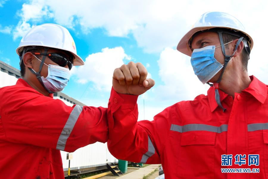 2020年11月27日,中国石油集团长城钻探工程公司古巴项目GW91钻井平台中方员工(左)同古巴员工互相致意。(图片来源:新华社 华金·埃尔南德斯摄)