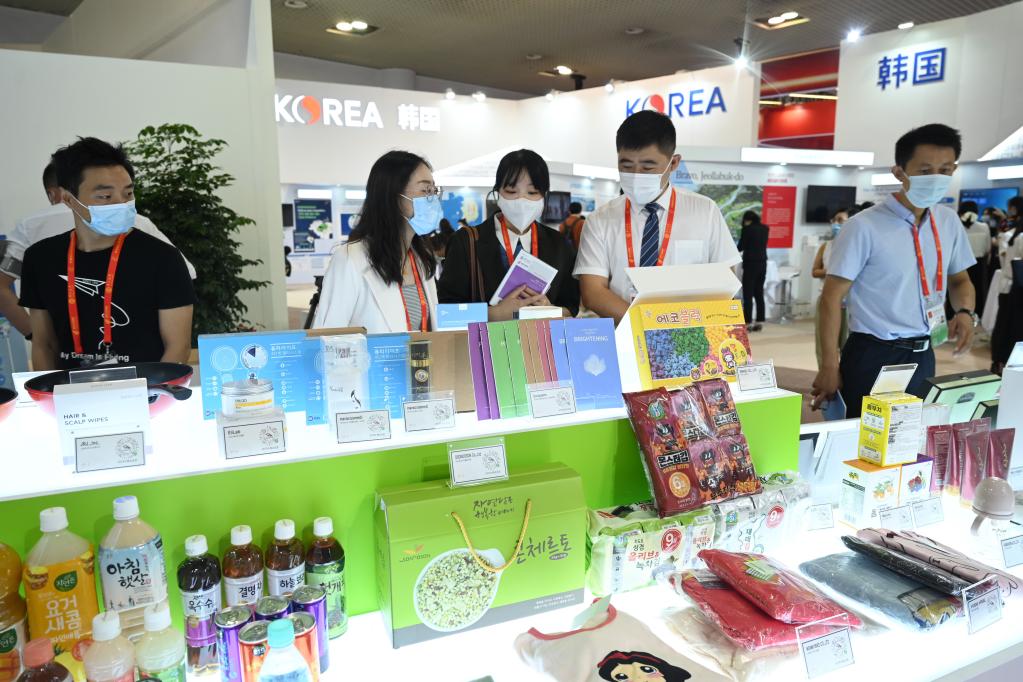 9月8日,参观者在第二十二届投洽会主宾国韩国的展位参观选购产品。新华社记者 林善传 摄